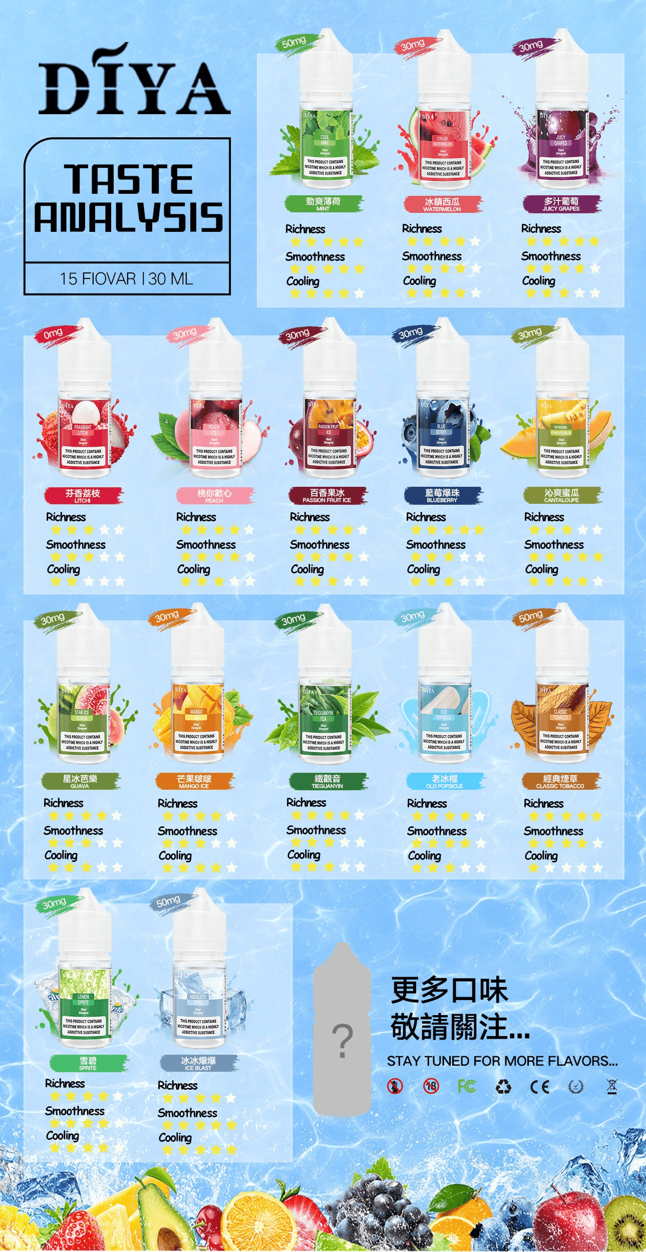 DIYA叮啞全新推出 15 種口味小煙油,0-50MG 尼古丁鹽濃度選擇,滿足不同需求。